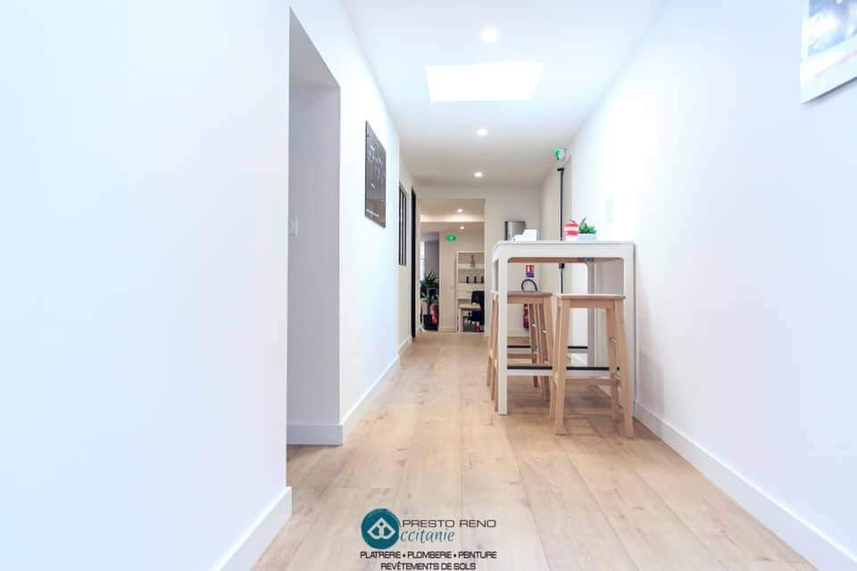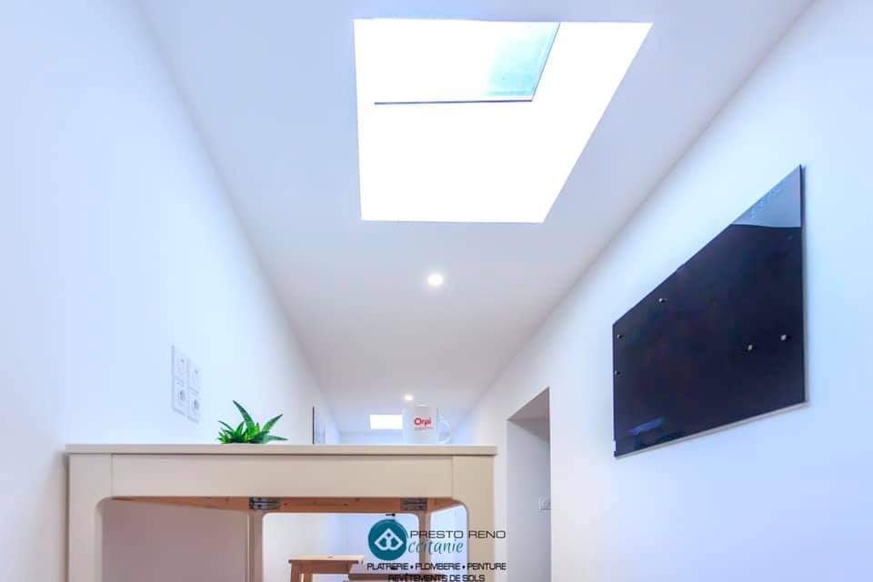 L’installation électrique a été entièrement refaite, accompagnée d’un éclairage moderne. Des verrières intérieures ont été intégrées pour conserver la luminosité naturelle et apporter une touche contemporaine. Une peinture complète est venue finaliser l’ensemble.