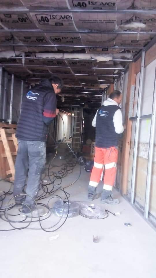 Plâtrerie générale, doublage, cloisons et faux plafonds avec isolation ont permis de restructurer les volumes et d’améliorer le confort. Les sols ont été repris intégralement avec ragréage et pose de parquet, tandis que les sanitaires (WC et salle de bain) ont été rénovés avec des matériaux adaptés.